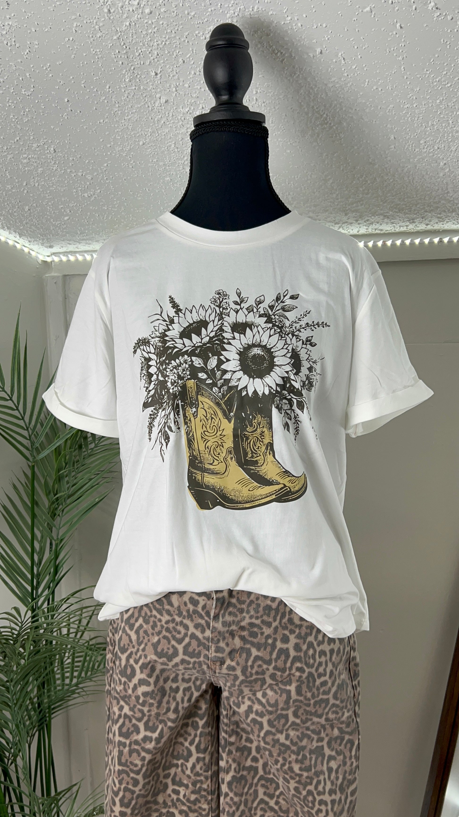 White Sunflower-Embroidered Cowgirl Boots T-Shirt